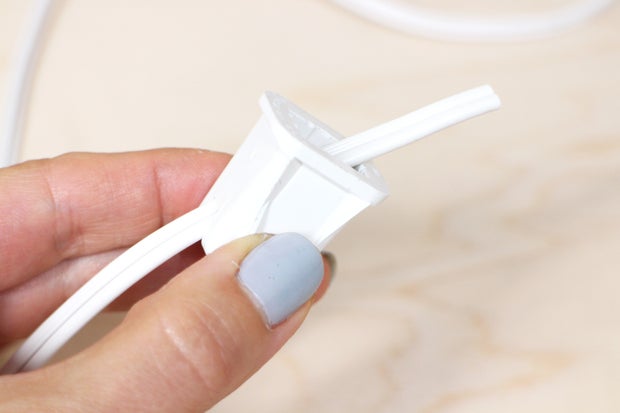 Passez les extrémités dénudées du cordon de la lampe à travers le trou latéral du capuchon. Écartez les fils d'environ 7,5 cm et faites un nœud d'assureur. (Comme ci dessus)