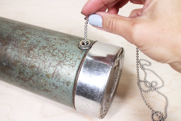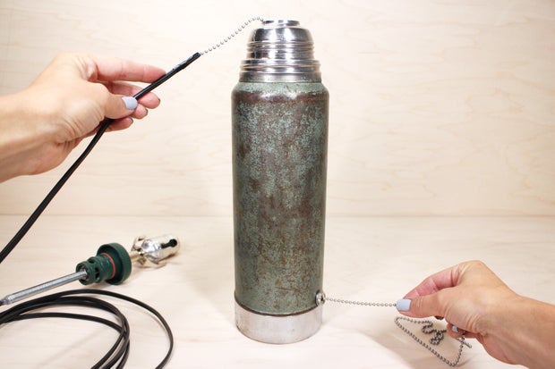 Nous allons utiliser la chaîne pour tirer le cordon dans le thermos et le faire sortir par le trou. Ce qui serait TRES difficile à faire autrement.