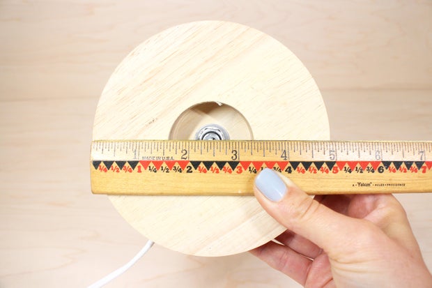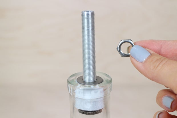 Pendant que vous serrez, assurez-vous que la tige filetée qui sort de l'écrou inférieur ne dépasse pas trop et que le cordon ne sera pas pincé une fois la lampe placée à la verticale. Il doit y avoir un espace d'au moins 3/8" entre le bas de la tige et le bas de la base en bois.