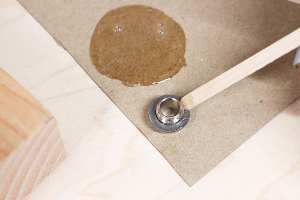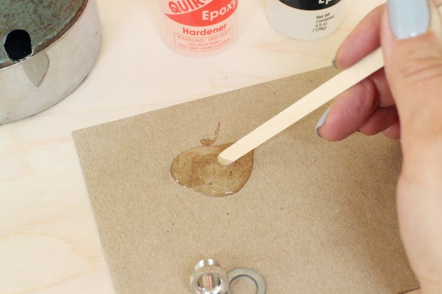 Utilisez de l'époxy 5 minutes (deux petites parties égales mélangées sur une surface jetable) et un clou ou un bâton de bricolage pour coller la rondelle à l'arrière de la bague. Laissez sécher.