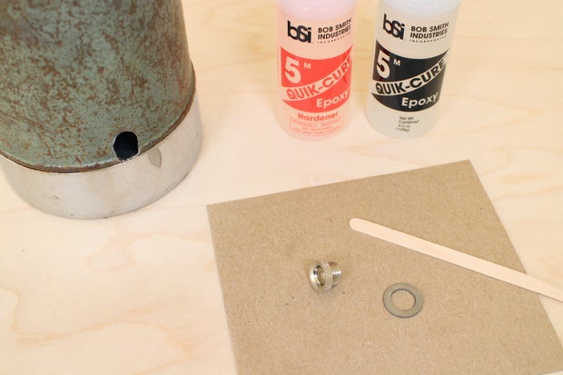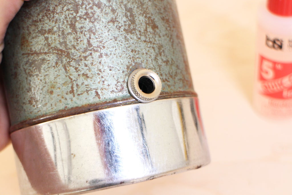 Maintenant que nous avons créé un moyen pour le cordon de sortir du thermos, nous devons ajouter une douille au trou pour protéger le cordon du tranchant du métal. J'ai fait le trou un peu plus grand que je ne le voulais, donc j'ajoute une rondelle derrière la douille afin de couvrir le trou (pour l'esthétique) et aussi pour que je puisse coller la douille en place.