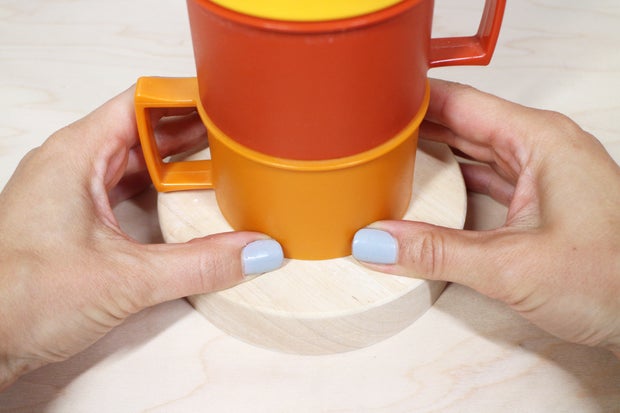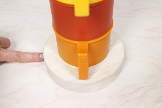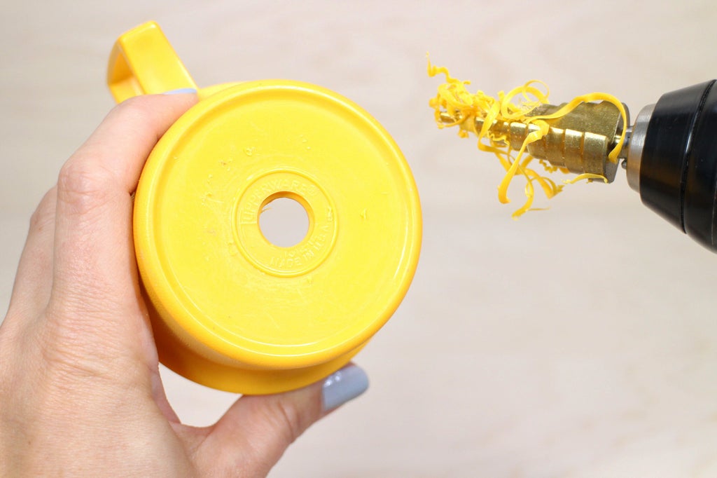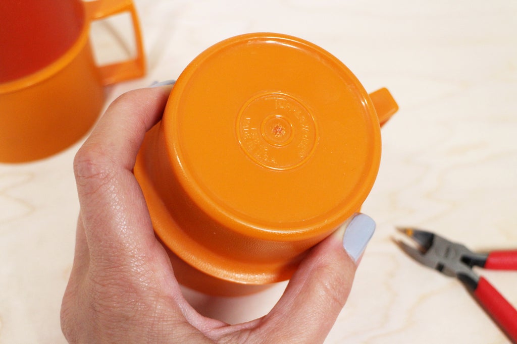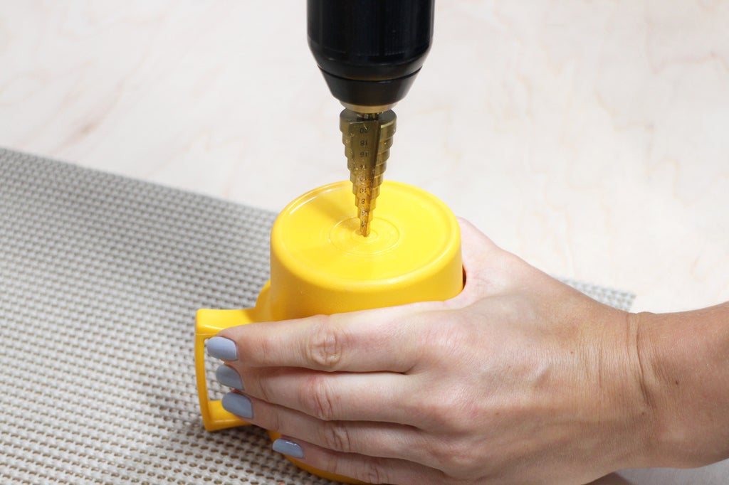 Si vous utilisez exactement les mêmes mugs que moi, ou un autre type de plastique, le fond aura un petit point en relief au centre. D'un côté, c'est génial car cela vous indique où se trouve le centre sans avoir à mesurer, mais malheureusement, il est difficile de percer sur une surface ronde comme celle-là.