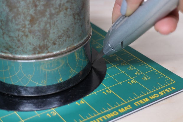 Il y a peu de chances que des cercles de feutre prédécoupés s'adaptent parfaitement à votre lampe "objet trouvé". Il faut généralement que vous personnalisiez leur ajustement, surtout si vous utilisez des feuilles de feutre au lieu de cercles. Pour ce faire, retirez l'endos de la feuille de feutre adhésive. Placez le bord de la base de la lampe un peu à l'intérieur du bord du cercle. L'objectif est d'obtenir un surplus de feutre tout autour.