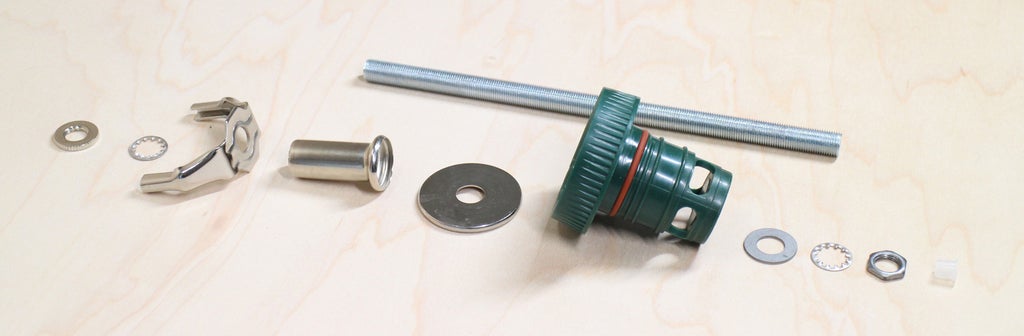 Ensuite, vissez l'un des écrous moletés sur le mamelon de façon à ce qu'il affleure le fond. Puis glissez une rondelle de blocage et enfin une rondelle normale.