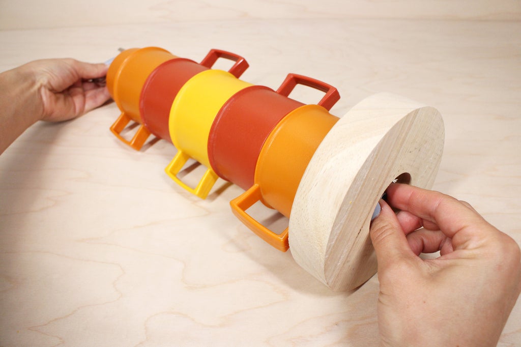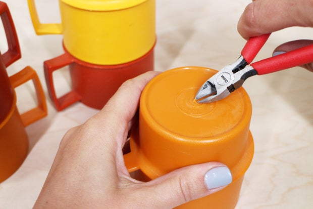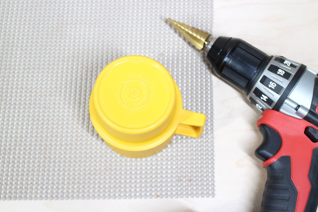 Avant de pouvoir assembler notre lampe, nous devons percer des trous dans les tasses pour y faire passer la tige centrale.