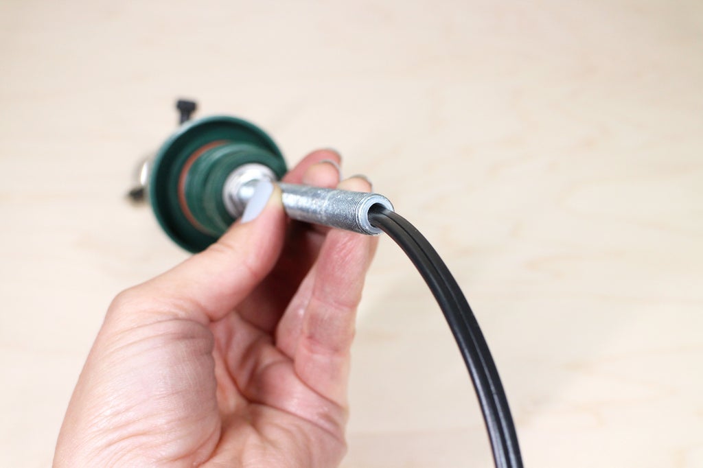 Introduisez une extrémité du cordon de la lampe par le trou latéral de la base en bois, et en gardant une grande boucle, envoyez le cordon dans la tige filetée et faites-le monter jusqu'à ce qu'il sorte du capuchon d'environ 3".