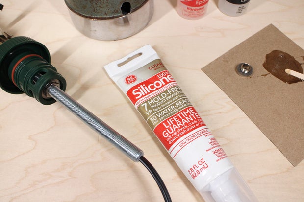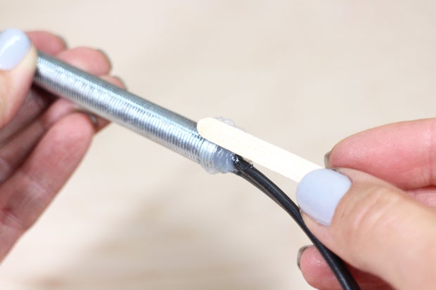 Remplissez l'extrémité du mamelon autour du cordon avec du silicone de cuisine/bain. Utilisez un bâton de bricolage ou un petit morceau de carton pour essuyer l'excédent de silicone.