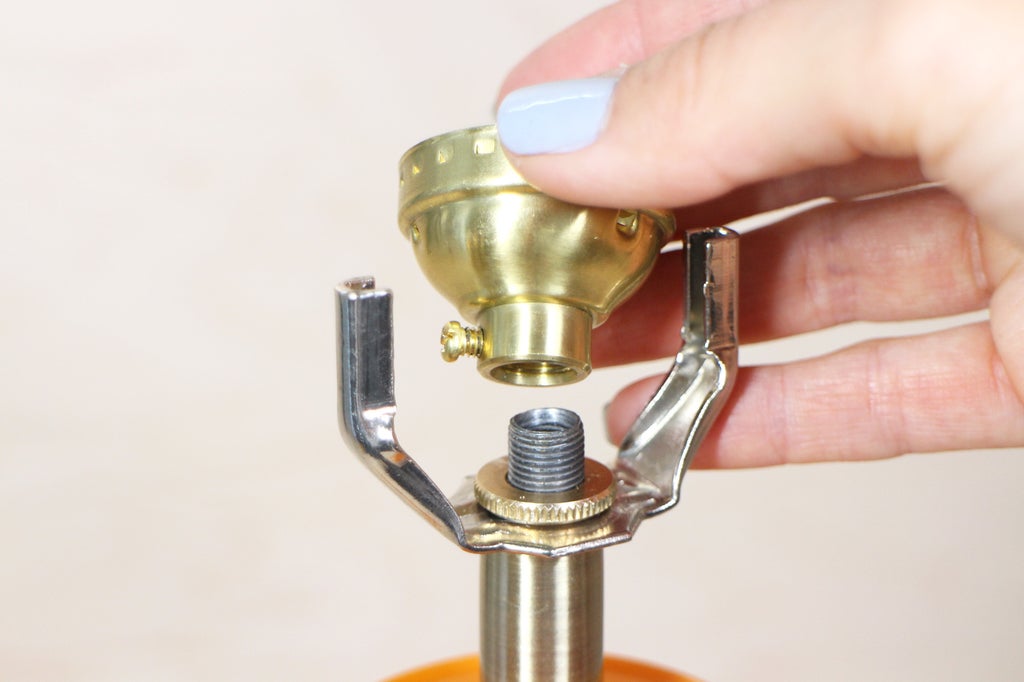 Remarque Importante : je n'ajoute jamais de harpe sur les petites lampes car je trouve qu'il y a plus de flexibilité dans le choix de l'abat-jour. Environ 50 % des abat-jour les plus petits sont munis d'une pince à ampoule intégrée au lieu d'une araignée/laveuse. J'expliquerai ça très clairement dans l'étape suivant.