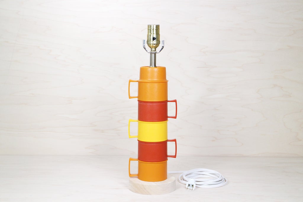 Des tasses creuses solides empilées sur une base de lampe de chevet officielle avec des trous pré-percés qui accueillent le cordon et une tige filetée centrale pour les connecter.