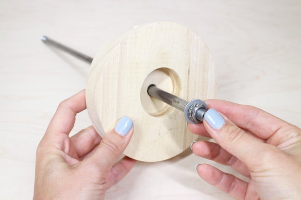 Jusqu'à ce que la quincaillerie atteigne la base. Replacez la base sur la table avec la tige dépassant vers le haut. Mettez de côté.